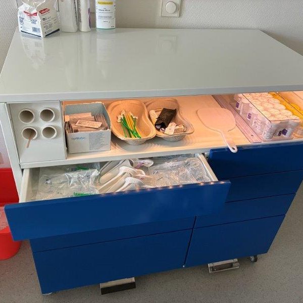 Für die gynäkologische Poliklinik haben wir in Absprache mit den Anwendern einen Schubladenschrank mit einem beleuchteten Teil und einer Schublade mit Heizung entwickelt, um die Instrumente „handwarm“ zu halten.